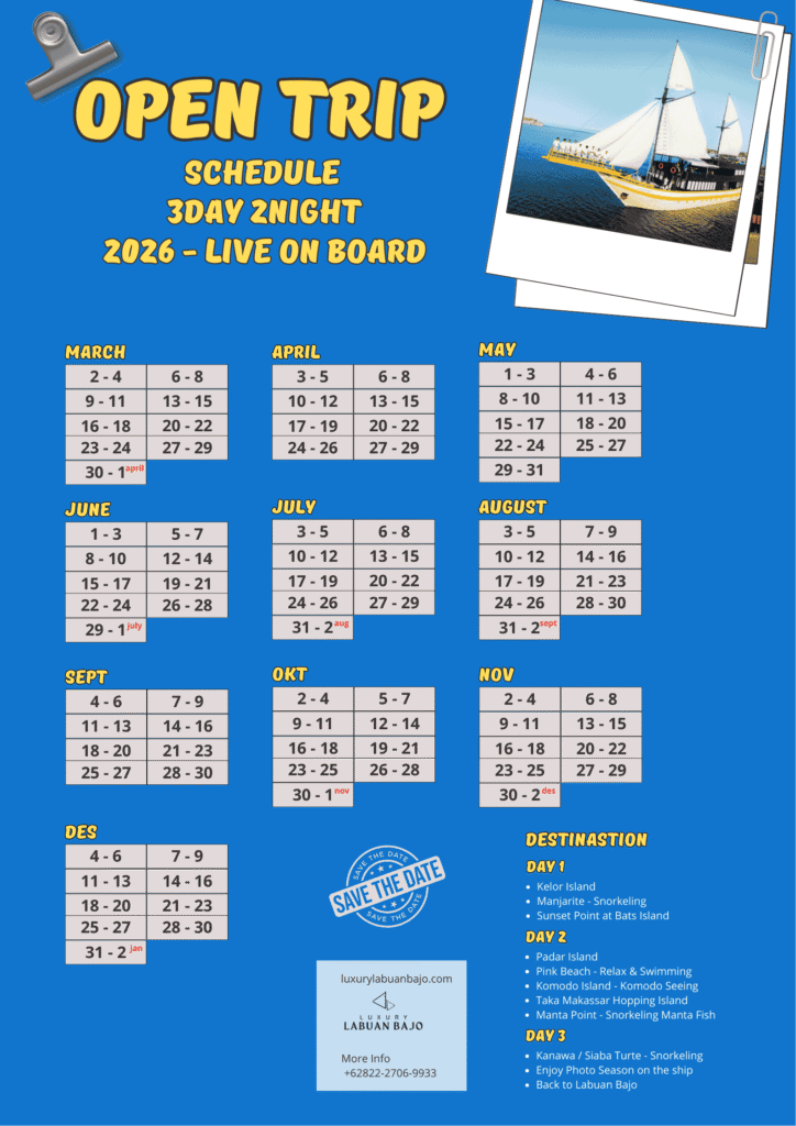 Open Trip Luxury Phinisi Labuan Bajo 3 Hari 2 Malam adalah pengalaman berlayar yang dirancang khusus untuk Anda, para petualang yang ingin sepenuhnya menikmati keindahan Taman Nasional Komodo dengan kenyamanan maksimal, layanan prima, dan suasana eksklusif. Selama tiga hari dan dua malam, Anda tidak hanya akan berpindah dari satu pulau ke pulau lain, tetapi Anda akan hidup di lautan, menyaksikan matahari terbit dari dek kapal, berenang bersama pari manta, dan bersantai di kapal phinisi mewah.
